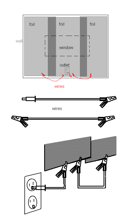 6) Then connect the alligator clip end to the bottom edge of a blanket, so that it grips onto both sides of the foil. Then use double-alligator wires to connect one blanket piece to another, so that an electrical pathway is traced between the grounded plug and the last blanket. The more grounded outlets used, the better.